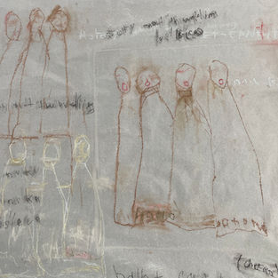 In this space between theory and practice, I’ve discovered the value of solitude, the courage to trust what feels right in the moment, and the meaning of creating as a woman. Sometimes this happens in relational presence; other times, in the independence of being alone. Conversations with materials unfold through various manifestations: sound, movement, drawn and written marks, and remnants—traces of memories in my body, on paper, on canvas, on the walls, and across the studio floor. This project moves through many iterations—each with a beginning and an end—yet remains fluid, never fully fixed, except in the fleeting moments of each ‘opening event.’ I call this ongoing, non-fixed research a/semic living diaries.